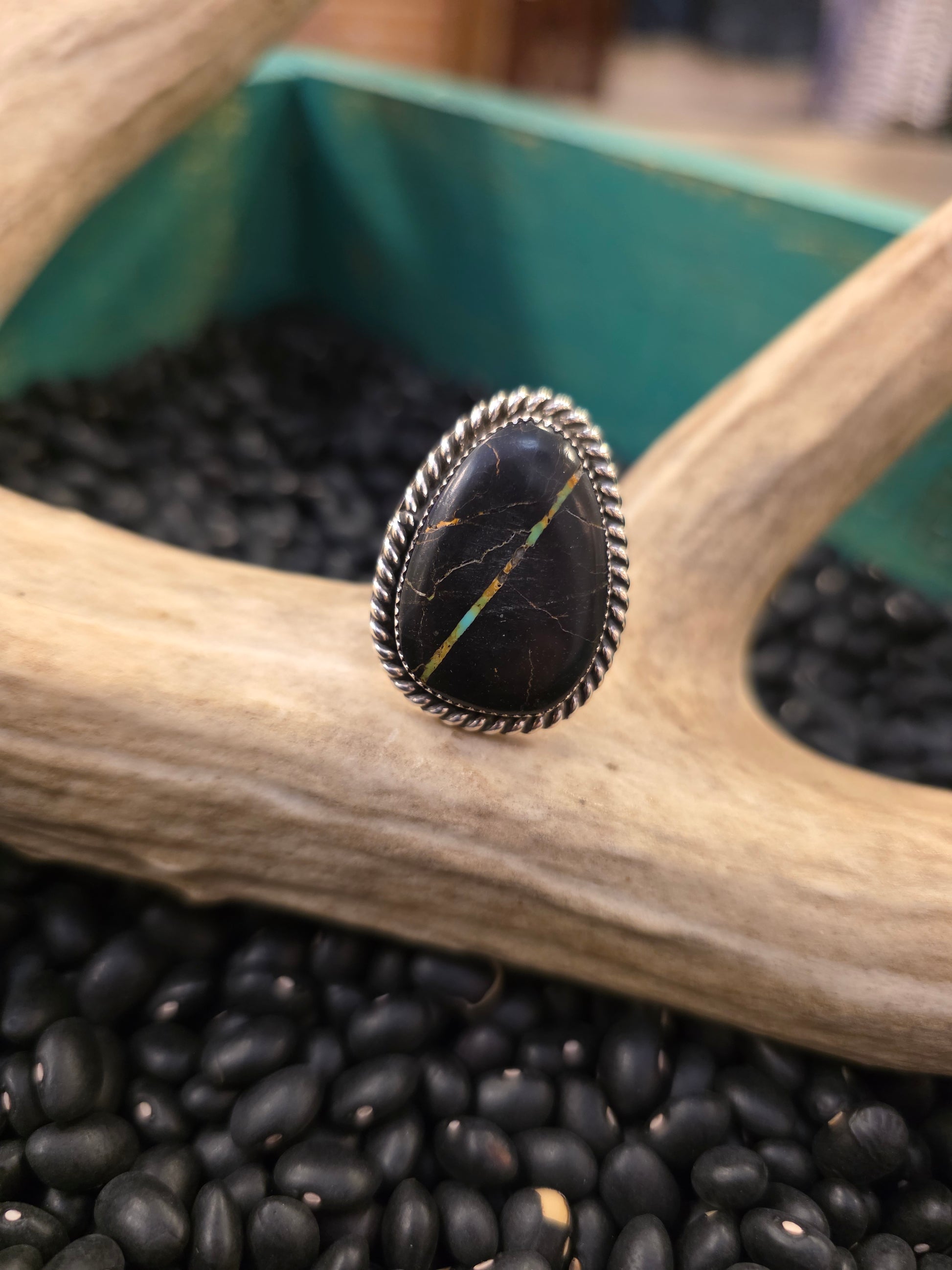 Size 8 Blackjack Ribbon Turquoise ring with a twisted wire border and double band. Made with Sterling & Fine Silver